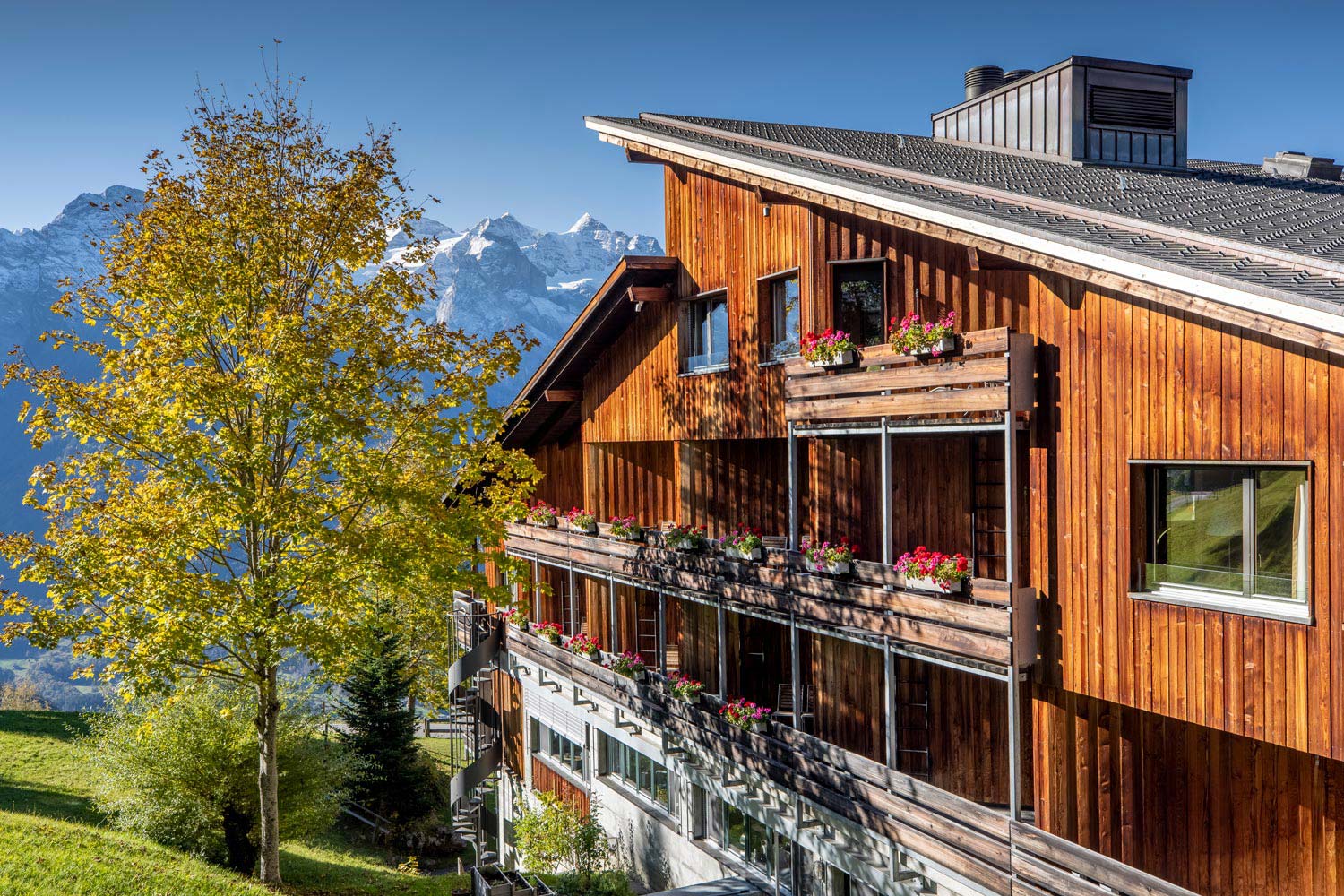 Bau mit Auszeichnung Die Architektur von Oskar Burri kommt in seinem Ursprung gerade im Panorama voll zur Geltung. Die Harmonie sowie die perfekt ausgerichteten Zimmer lösen ein Wohlgefühl aus. Die architektonische Qualität und die harmonische Einordnung in die Umgebung veranlassten den Berner Heimatschutz dem Hasli-Zentrum 1982 die «Auszeichnung für Gutes Bauen» zu verleihen.